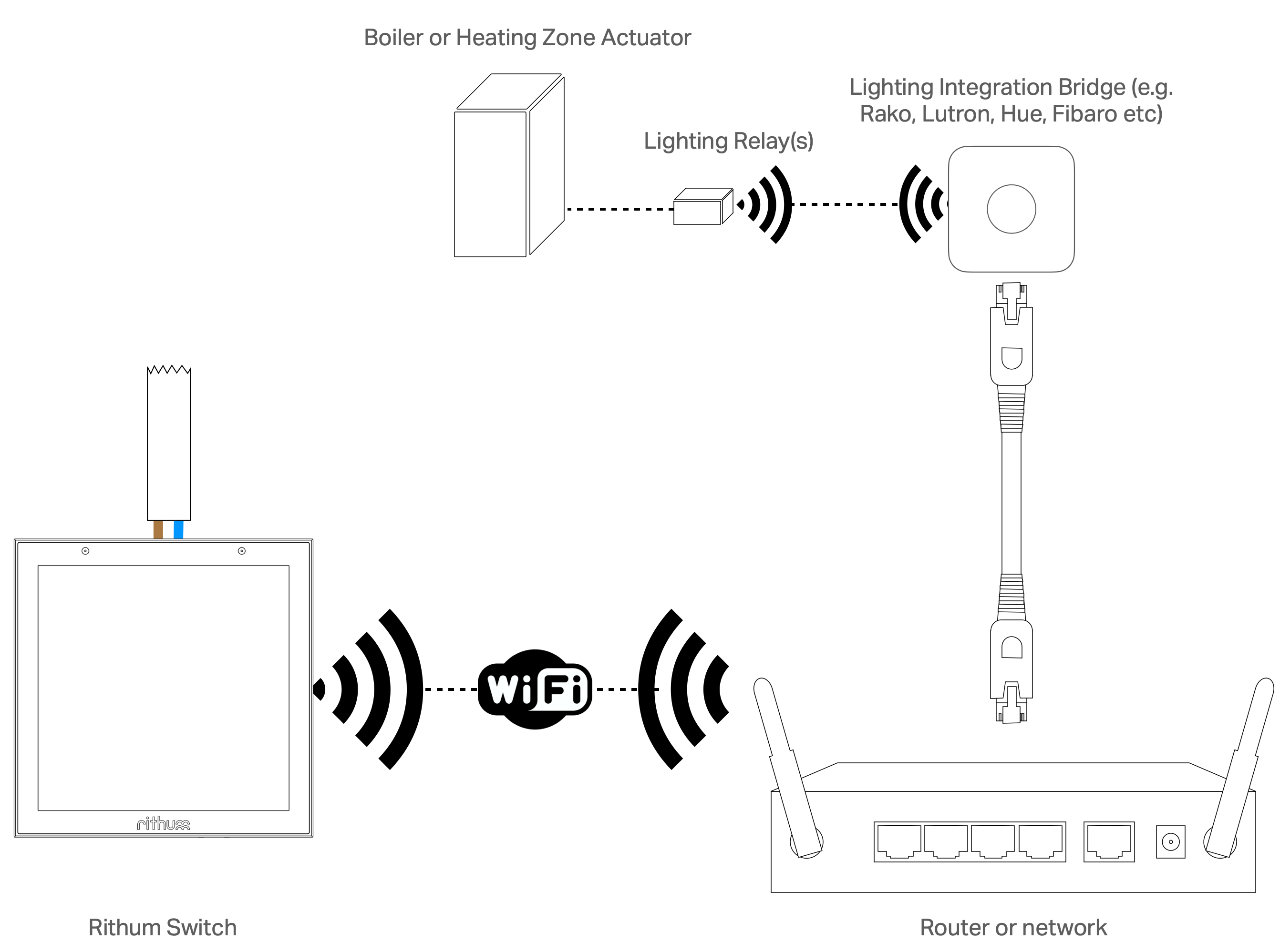Using Rithum's climate control system and built in temperature sensor, Rithum Stat, you can control your home's temperature at just a touch of a button. In the topology below you can see how this works in practice.