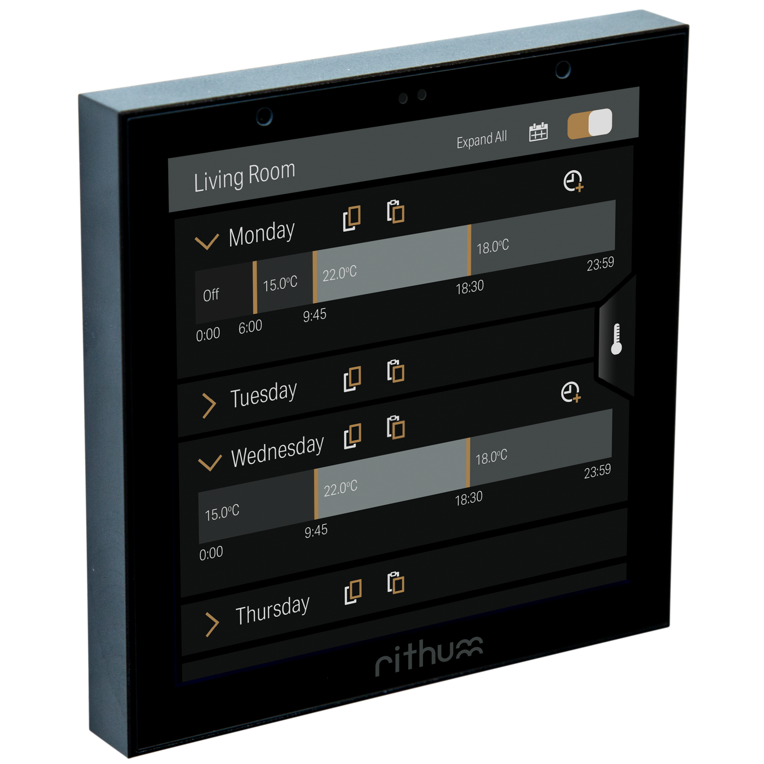 Rithum Stat is our built in thermostatic software. Utilising the built-in temperature sensor, when paired with a relay from one of our integrations, it offers a complete heating control solution. It supports the climate screen which allows you to tweak your room or property manually or using the seven-day scheduler.